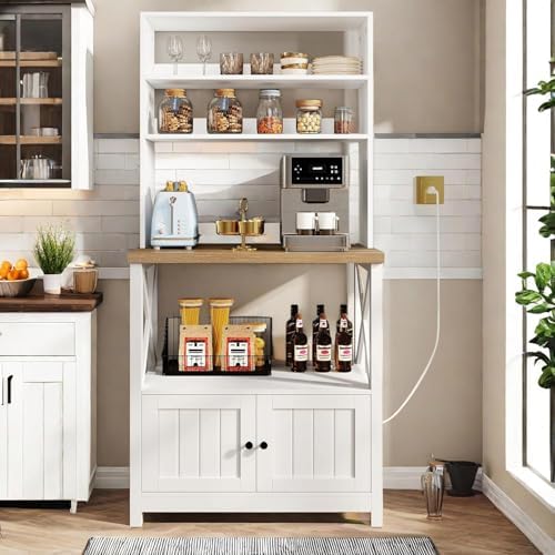 View full detailsDWVO White Baker Rack with Power Outlet and Storage, Farmhouse Microwave Stand with Door for Kitchen, 5-Tiers Tall Coffee Bar Station Cabinet Thickened Counter with Hutch Shelves