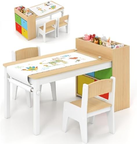 View full detailsINFANS Kids Art Table and Chair Set, Toddler Craft Play Wood Activity Desk with Paper Roll 2 Chairs Storage Canvas Bins for Writing Drawing, Children Furniture for Daycare Nursery Boys Girls Ages 3+