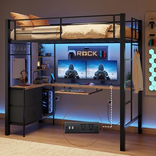 View full detailsGizoon Twin Loft Bed with L-Shaped Desk and LED Lights, Charging Station, Storage Shelves, Heavy Duty Metal Loft Bed Frame with Drawers, Safety Guard & Ladder, No Box Spring Needed, Space-Saving,Brown