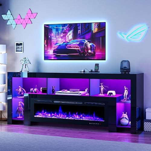 View full details94.5" Fireplace TV Stand for TVs Up to 100", Gaming LED Entertainment Center with 50" Electric Fireplace, Modern High Gloss Media Console for Living Room, Glass Shelves & Open Storage, Black