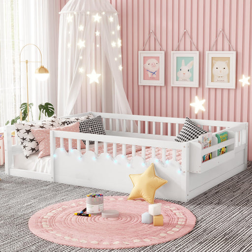 View full detailsDuxelifin Full Toddler Floor Bed with High Rails, Wooden Montessori Bed Frame with Light and Storage Shelf, Full Size Bed Frame for Kids, Boys and Girls, White