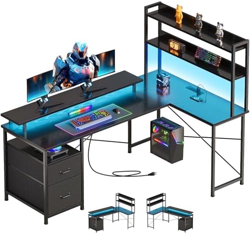 View full detailsL Shaped Gaming Desk with Shelves,Reversible Computer Gaming Desk with LED Lights and Charging Station,Home Office Corner Desk with Monitor Stand,Black