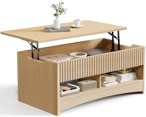 View full detailsAmada Lift Top Coffee Table with Storage Shelf & Hidden Compartment, Modern Fluted Rectangle Dining Table for Living Room, Home Office,Natural Oak