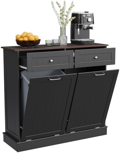View full detailsDouble Tilt Out Trash Can Cabinet, 20 Gallon Freestanding Kitchen Trash Can Holder with 2 Hideaway Drawers & Cutting Board, Pet Proof Hidden Garbage Recycling Cabinet Laundry Hamper, Black