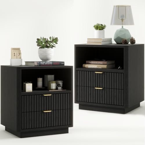 Fluted Nightstands Set of 2, Black Night Stands with 2 Drawers and Open Shelves, Wooden Bedside Table Modern Design End Table for Bedroom Sofa Office (2, Black)