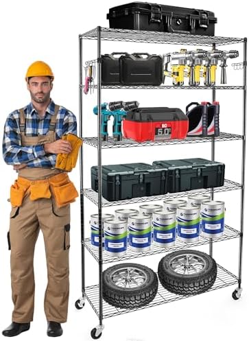 View full detailsYNN Storage Shelves,2100Lbs 6 Tier Heavy Duty Metal Rolling Shelving Unit with Wheels & 8 Hooks, Adjustable Garage Wire Rack for Kitchen, Bathroom,Industrial,Pantry(36" W x 14" D x 72" H,Black)