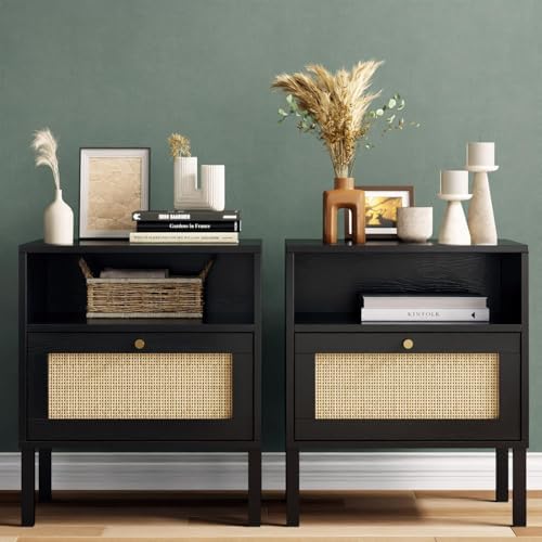 View full detailsRattan Night Stand Set 2, Boho Bedside Table Black Nightstand with Rattan Door, Storage Cabinet, Open Storage Space & Sturdy Metal Legs, Accent Bed Side Table, Wood End Tables Bedroom