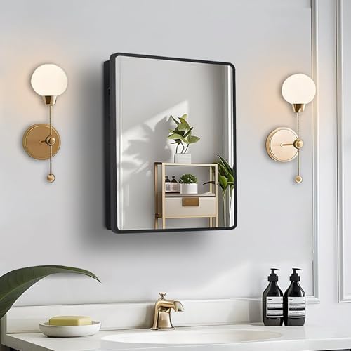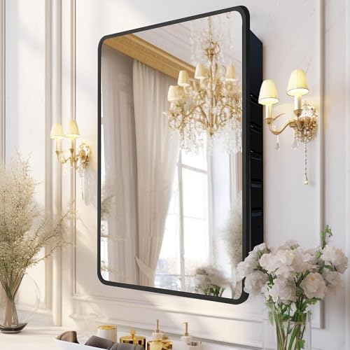 View full detailsMedicine Cabinet with Mirror, 16x22 inch Black Recessed Medicine Cabinet or Surface Wall Mount Bathroom Cabinets with Adjustable Shelves Metal Framed Mirror, Rounded Rectangle Storage Cabinet