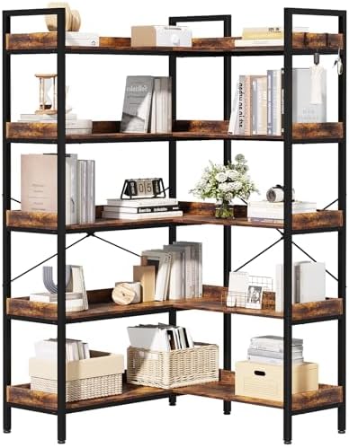 View full detailsKOUSEI 5-Tier L-Shaped Reversible Corner Bookshelf, 65" Rustic Brown Industrial Wood & Metal Bookcase, Wide Open Shelves + 4 Hooks for Living Room/Bedroom/Home Office