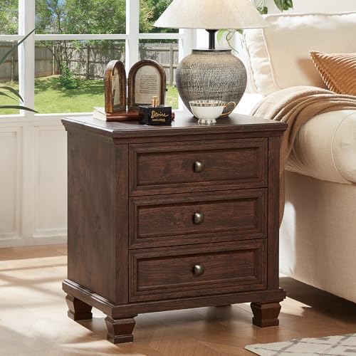 View full detailsFarmhouse Nightstand with 3 Drawers, Rustic Couch End Table with 4 Square Solid Wood Legs, Mid-Century Modern Bed Side Table with Storage, Small Dresser for Bedroom, Living Room, Walnut
