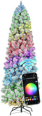View full detailsHOLLO STAR 6 ft Flocked Prelit Christmas Tree with 250 LED Lights, App Control, Skinny Artificial Pencil Christmas Tree, Multi-Color RGBW Lights, 770 Branch Tips, for Small Space, Home, Party