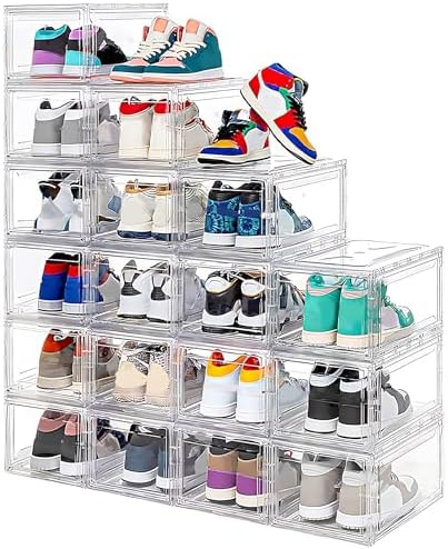 View full details12 Pack Acrylic Clear Shoe Boxes– Ultra Clear Plastic Stackable Sneaker Storage For Sneakerhead. Professional Grade Shoe Display Case with Magnetic Door .Boots and Hat Organizer.Fits US Size 15