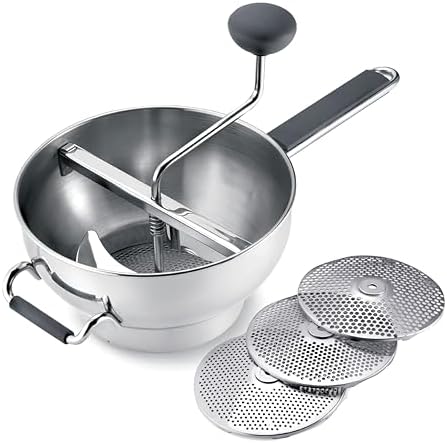 Deluxe food mill by Cuisipro with 3 interchangeable disks in 2mm, 3mm, and 4mm sizes Extra-large 18/10 stainless steel bowl with non-slip ha...