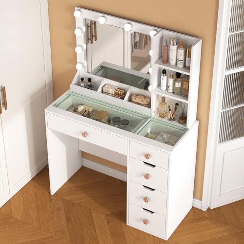View full detailsMakeup Vanity Desk with Mirror and Lights,35.4" White Vanity with Glass Top,Vanity Table with 5 Drawers,3 Lighting Modes & Brightness Adjustable Dressing Table for Bedroom