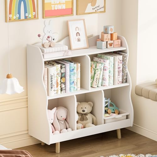 View full detailsTreocho Kids Bookshelf and Toy Storage Orangizer, 3-Tier Wooden Children's Bookcase with Curve Design, 5 Cubbies Toy Storage Cabinet Display with Legs for Children's Room, Playroom, School, White