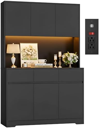 View full detailsFINETONES 71" Tall Pantry Cabinet with Power Outlets and Led Lights, Large Kitchen Hutch Storage with Microwave Stand, Black Pantry Kitchen Cabinet with Cupboard