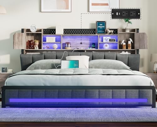 View full detailsQueen Bed Frame with Storage Bookcase Headboard & LED Lights, Upholstered Bed Frame Queen Size with USB Charging Station, Heavy Duty Metal Slats, No Box Spring Needed, Oak Gray