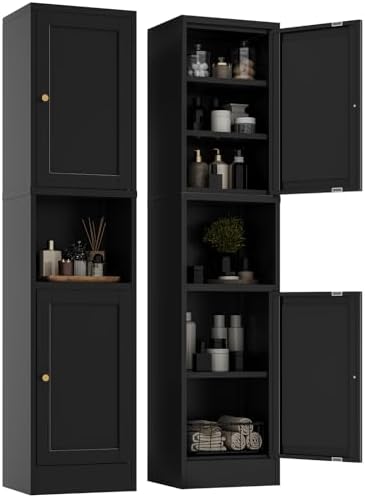 View full detailsNarrow Metal Cabinet with Open Countertop,Tall Pantry Storage Organizer with 3 Adjustable Shelves and 2 Doors, Slim Bathroom Storage Cabinet for Small Spaces,kitchen,Home Office, Dining Room,Black