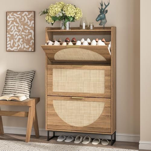 View full detailsMaupvit Rattan Shoe Storage Cabinet with 3 Flip Drawers, Freestanding Shoe Organizer with Metal Legs for Entryway, Hidden Golden Handles, Narrow Shoe Rack Cabinet, Rustic Oak Rattan