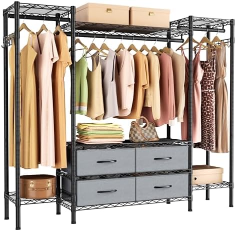 View full detailsLarge Garment Rack Heavy Duty Clothes Rack,Freestanding Closet Portable Clothing Rack with 8 Adjustable Wire Shelves,3 Hang Rods,4 Fabric Drawers,2 Hooks,Metal Closet Storage Wardrobe,MaxLoad 900lbs