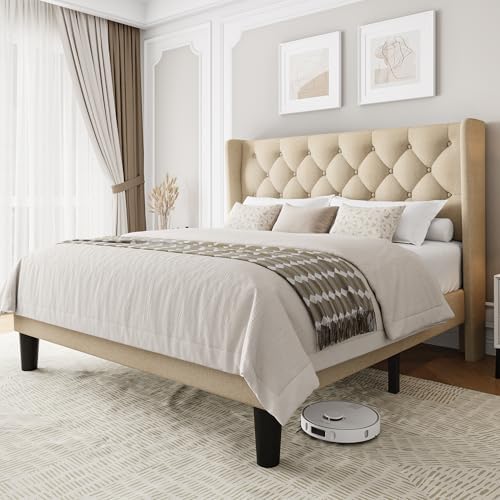 View full detailsQueen Size Upholstered Bed Frame with Wingback Headboard, Fabric Linen Platform Bed, 8" Under Bed Storage, Wooden and Metal Slats Support, Noise Free, No Box Spring Needed, Beige