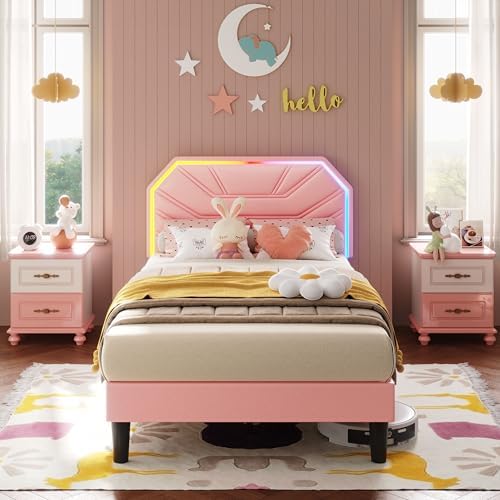 View full detailsLIKIMIO Twin Bed Frames with LED Light Headboard, Upholstered Modern Cama Twin Platform Bed Frame with Heavy Duty Supports, No Box Spring Need, Noise Free, Easy Assembly, Pink