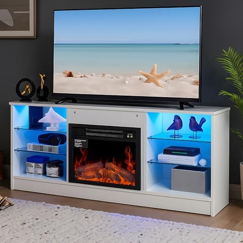 View full detailsFireplace TV Stand with LED Lights, Modern Entertainment Center with Electric Fireplace for TV up to 65", TV Console Table with Open Storage Shelves for Living Room Bedroom (White)