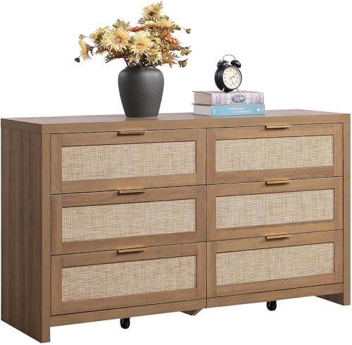View full detailsSICOTAS Rattan Dresser for Bedroom, 56.9" Wide 6 Drawer Dresser with Ample Storage, Dressers Large Chest of Drawers, Closet, Boho TV Stand for Bedroom (Reclaimed Caramel Oak, 1 Piece)