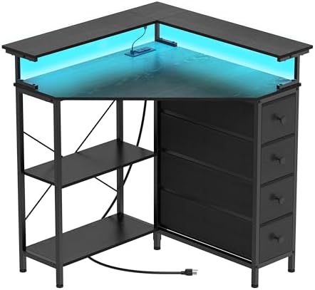 View full detailsCorner Desk with Drawers Shelves for Small Space 90 Degrees Triangle Computer Desk with Power Outlets,Gaming Desk with LED Lights Monitor Stand for Home Office Workstation Writing Table (Black)