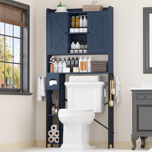 View full details32"W Over The Toilet Storage Cabinet with Metal Frame and 7 Storage Shelves, Bathroom Organizer with Adjustable Shelves and Paper Holder, Farmhouse Storage Cabinet for Bathroom, Laundry, Dark Blue