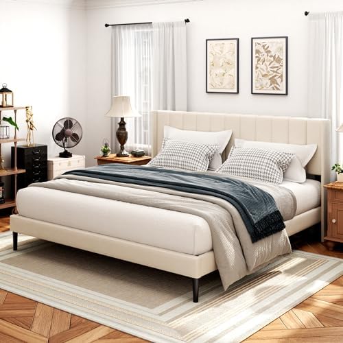 View full detailsKing Size Bed Frame and Headboard,Vertical Channel Tufted Wingback No Box Spring Needed, Mattress Foundation, Easy Assembly, Beige