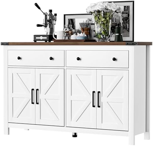 View full details55" Sideboard Buffet Cabinet with Storage, Coffee Bar Cabinet with 2 Drawers and 4 Barn Doors, Long Storage Cabinet Modern Farmhouse, White Wood, for Kitchen, Dining Room, Living Room