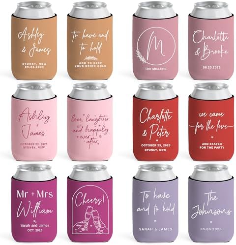 View full details100 pcs Personalized Can Sleeves for Wedding & Party Favors – Custom Drink Holders for Anniversary, Engagement, Bridal Showers – Bulk Gifts for Guests, Fits 12-16oz Cans & Bottles (100, Standard)