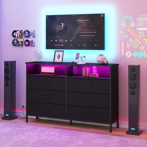 View full detailsDresser for bedroom, Fabric Black Bedroom Dresser with LED Lights and Charging Station, 6 Long Drawers Dressers, Tall Wide Chest of Drawers Storage Organizer TV Stand for up to 60" TV for Living Room