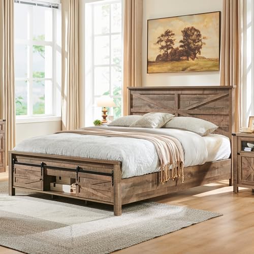 View full detailsJXQTLINGMU King Farmhouse Wood Bed Frame with Sliding Barn Door Storage Cabinets, Solid Wood Slats Support, Noiseless, No Box Spring Needed, Warm Brown
