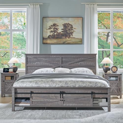 View full detailsJXQTLINGMU King Farmhouse Wood Bed Frame with Sliding Barn Door Storage Cabinets, Solid Wood Slats Support, Noiseless, No Box Spring Needed, Grey