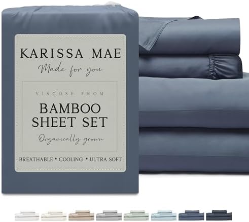 View full detailsKARISSA MAE Cooling Bamboo Viscose King Size Sheet Set | 100% Organically Grown | 18” Deep Pocket | Silky, Soft, & Hypoallergenic | with Organizer Band & Elastic Corner Straps [Slate Blue]