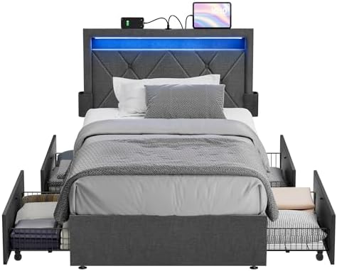 View full detailsVASAGLE LED Bed Frame Twin Size, Twin Bed with Headboard and 4 Drawers, 1 USB Port and 1 Type C Port, Adjustable Upholstered Headboard 37.1/39.6 Inches, No Box Spring Needed, Dark Gray URMB823G71