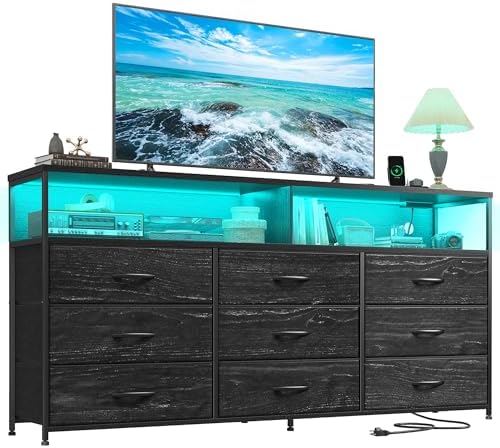 View full details55" W Dresser for Bedroom with 9 Drawers, LED TV Stand with Power Outlets for 45, 55, 65 Inch TV, Sturdy Long Chest of Drawers with Extra 2 Wooden Shelves, Grain Black