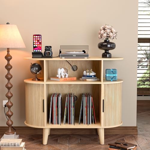 View full detailsLarge Round Record Player Stand with Charging Station & USB Ports,Record Storage Cabinet, Mid Century Modern Turntable Stand for Bedroom Living Room (Small Oak)