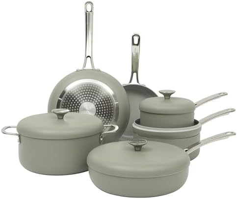 View full detailsSur La Table Kitchen Essentials Potluck Porch 10 Piece PFA Free Ceramic Non stick Interior Forged Aluminum Cookware Pots and Pans Set W/Aluminum Lids - Green - Induction Compatible
