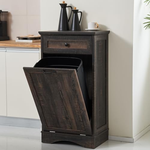 View full details13 Gallons Tilt Out Trash Cabinet Freestanding Kitchen Trash Bin Cabinet Wood Garbage Recycling Cabinet with Hideaway Drawer Pet Proof Trash Can Holder for Kitchen Living Room, Dark Black