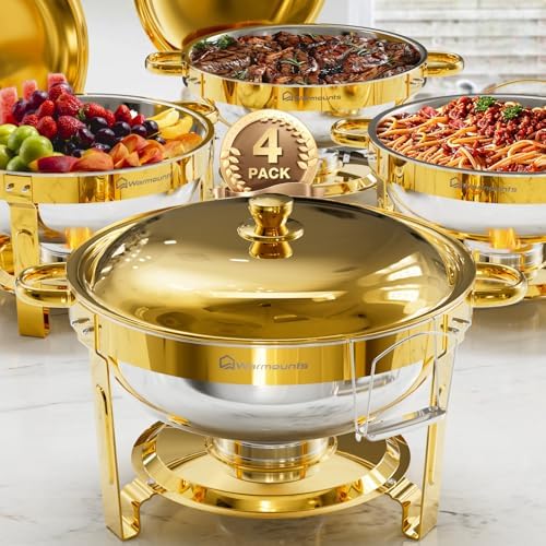 View full detailsWARMOUNTS Gold Chafing Dishes for Buffet (5QT, 4 Pack), Round Stainless Steel Chafer and Warmer Set with Lid Holder, Mirror-polished, Rolled Rim Process (No Finger Cuts), for Catering, Party, Wedding