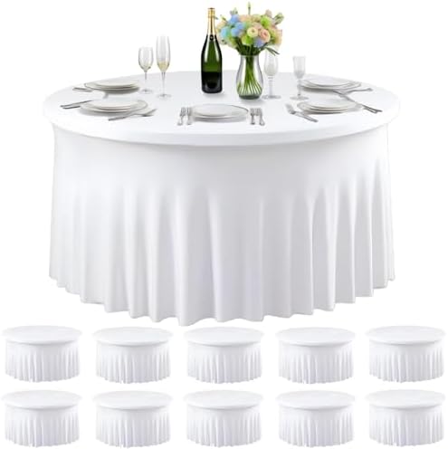 View full details10 Pack White Spandex Round Tablecloths for 60inch Tables, 120 Inch Stretchy Fitted Round Tablecloth Wrinkle Free Washable Polyester Table Cloths Cover for Wedding Party Birthday Dining Banquet