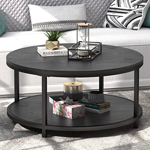 WiberWi Round Coffee Table Black 35.8" Circle Coffee Tables for Living Room Rustic Industrial Design with Sturdy Metal Frame Legs and Open Storage Shelf, Easy Assembly
