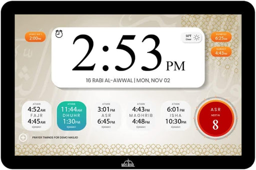 View full detailsMasjidal 14" Digital Azan Clock with WiFi, Dynamic Touch Screen, Worldwide Prayer Times, Full Quran Player, Islamic Art, Streaming Halal Muslim Content: Duas, Dhikr, Hadith, Surah of The Day, Black