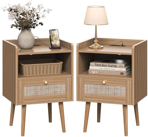 View full detailsNight stand Set of 2, Bedside Tables with Charging Station, Rattan End Tables, Boho Bed Side Tables, Wood Nightstands set of 2 for Kids' Room Farmhouse Bedroom Living Room Dorm Sofa Couch (Natural)