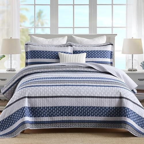 View full detailsHomzard Bedding Set, King Size Quilt, 100% Cotton, Blue Floral Striped, All Season, 3 Piece Includes Quilt and 2 Shams, Farmhouse Style