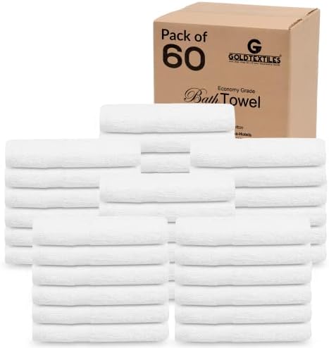 View full detailsGold Textiles 60 Pack White Hotel Bath Towels Bulk 20x40 Inches - Cotton Blend Economy Cheap Bath Towel for Commercial Uses, Gym, Salon, Spa & Hair - Lightweight Quick Dry (60 Pcs White)