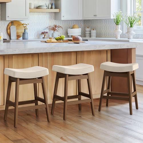 View full detailsBar Stools Set of 3, Barstools with Sturdy Wood Legs, Saddle Seat Counter Height Bar Stools for Kitchen Counter, Bar, Dining, 24 Inch Farmhouse Counter Stools, Linen Fabric